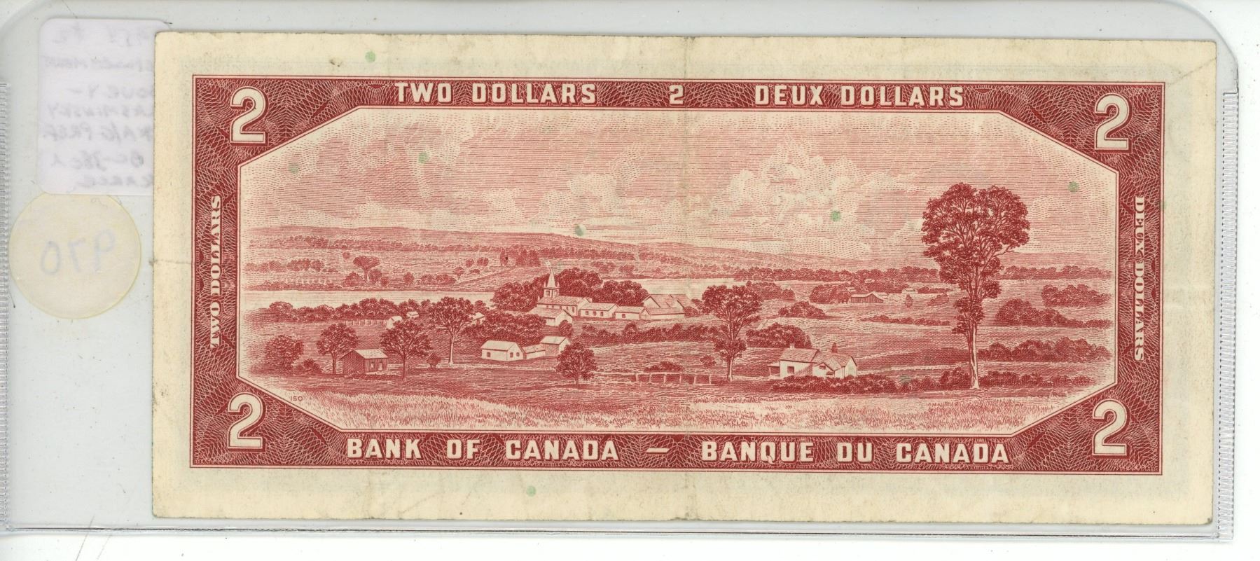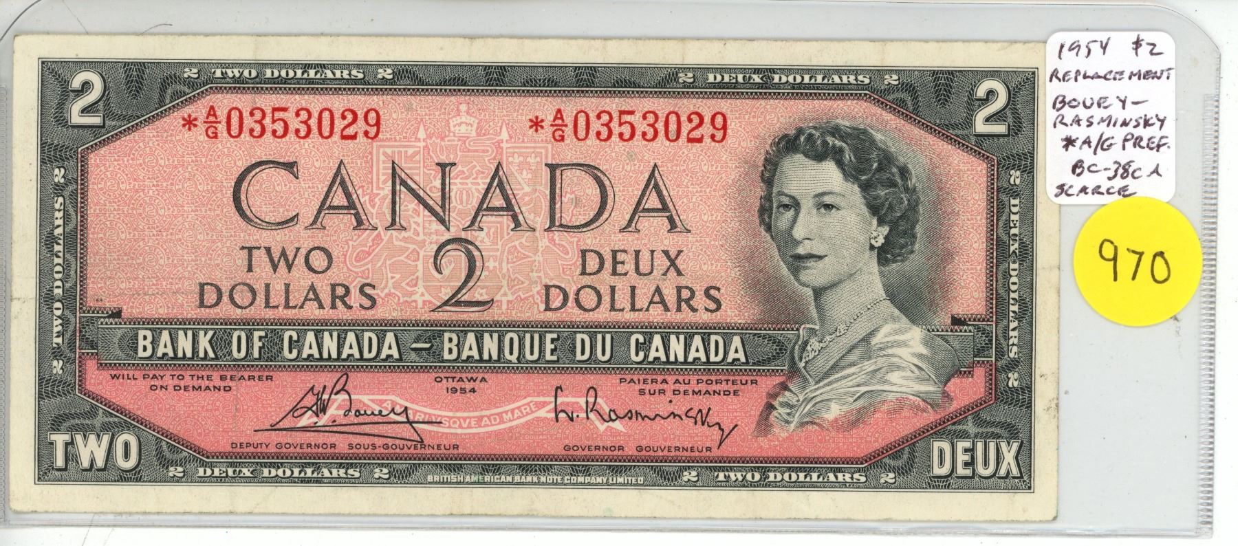 1954 $2 Replacement Note. Modified Portrait. Bouey-Rasminsky signatures. *A/B Replacement Prefix. BC-38cA. Fine. Scarce.