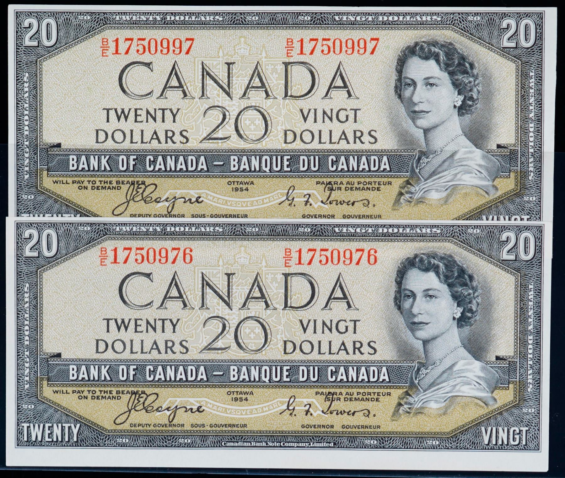 1954 $20 BC-33a #B/E1750976-0997 Lot of 2 consecutive notes Uncirculated or better.