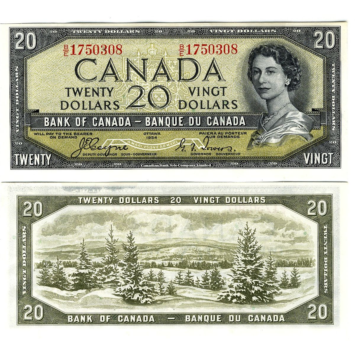 1954 $20 BC-33a #BE1750307/308. Lot of 2 consecutive notes AU/UNC with light oil type stain on upper border of notes.
