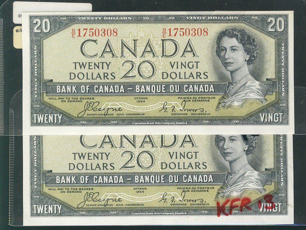 1954 $20 BC-33a #BE1750307/308. Lot of 2 consecutive notes AU/UNC with light oil type stain on upper border of notes.