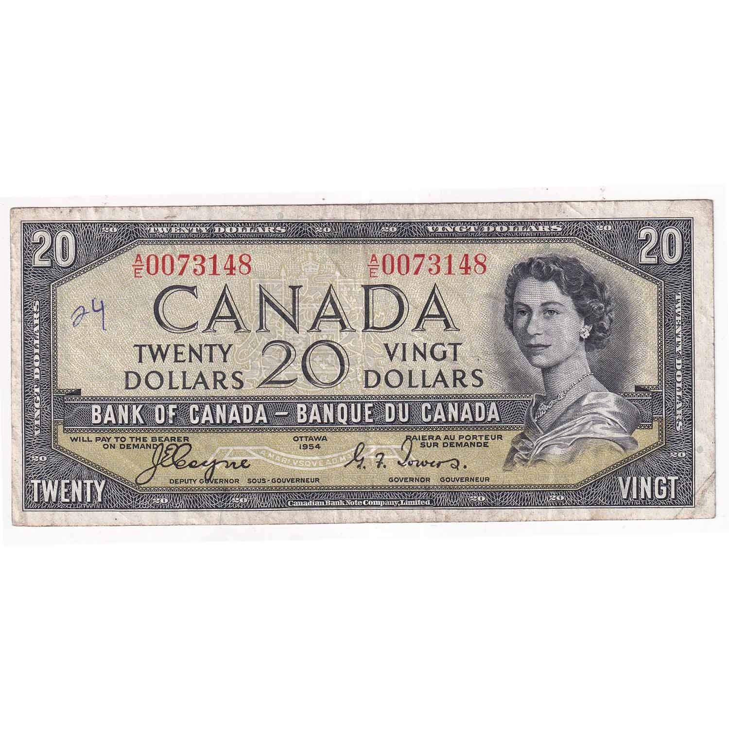 1954 $20 BC-33a, Bank of Canada, Coyne-Towers, Devil's Face, A/E Prefix, VF (Writing)
