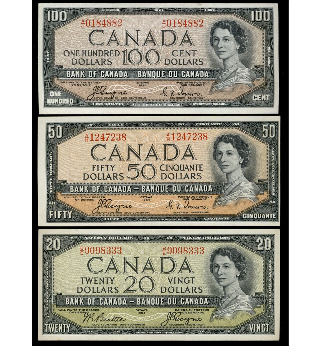 1954 $20 BC-33b #BE9098333, $50 BC-34a & $100 BC-35a. Lot of 3 notes both lightly pressed EF to EF+ notes.