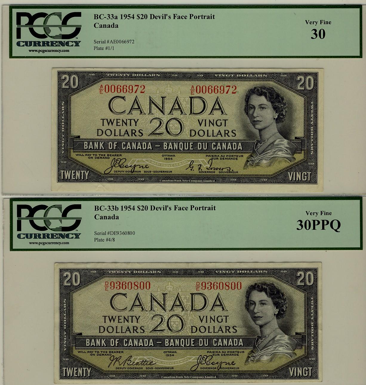 1954 $20 BC-33b #D/E9360800 PCGS VF30PPQ and BC-33a #A/E0066972 PCGS VF30