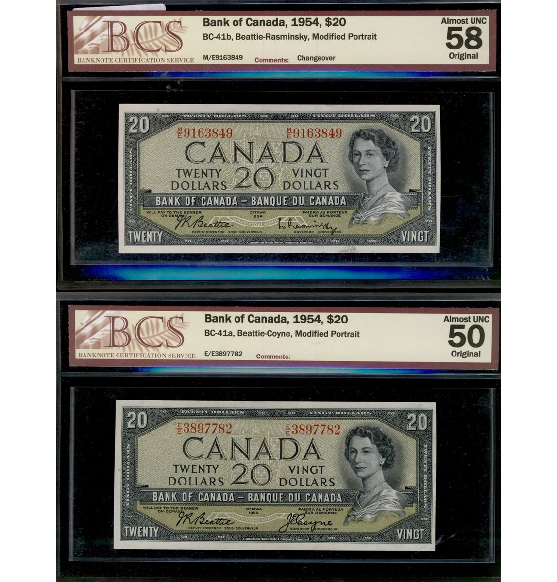 1954 $20 BC-41a #EE3897782 AU50 & BC-41b #ME9163849 AU58. Lot of 2 notes BCS graded.
