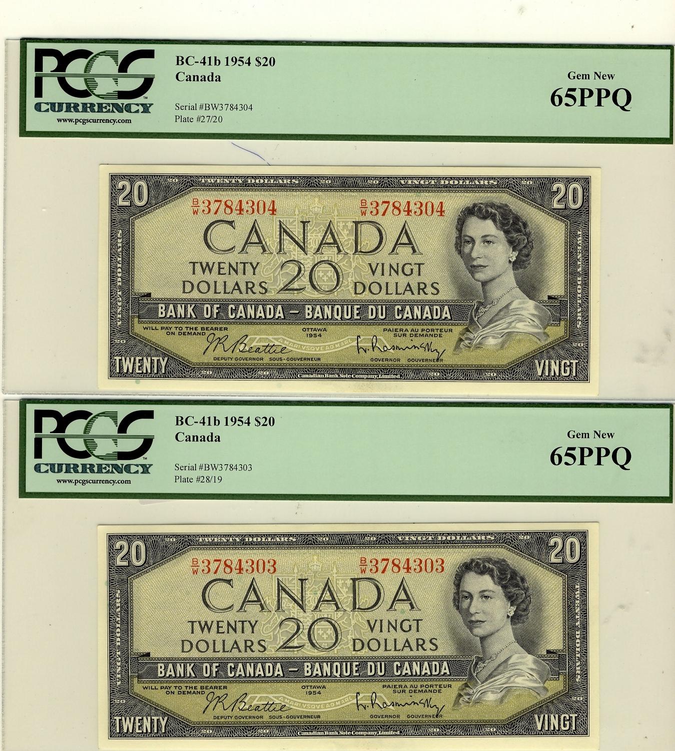 1954 $20 BC-41b #BW3784303-304 PCGS Gem UNC65PPQ. Lot or 2 consecutive notes.