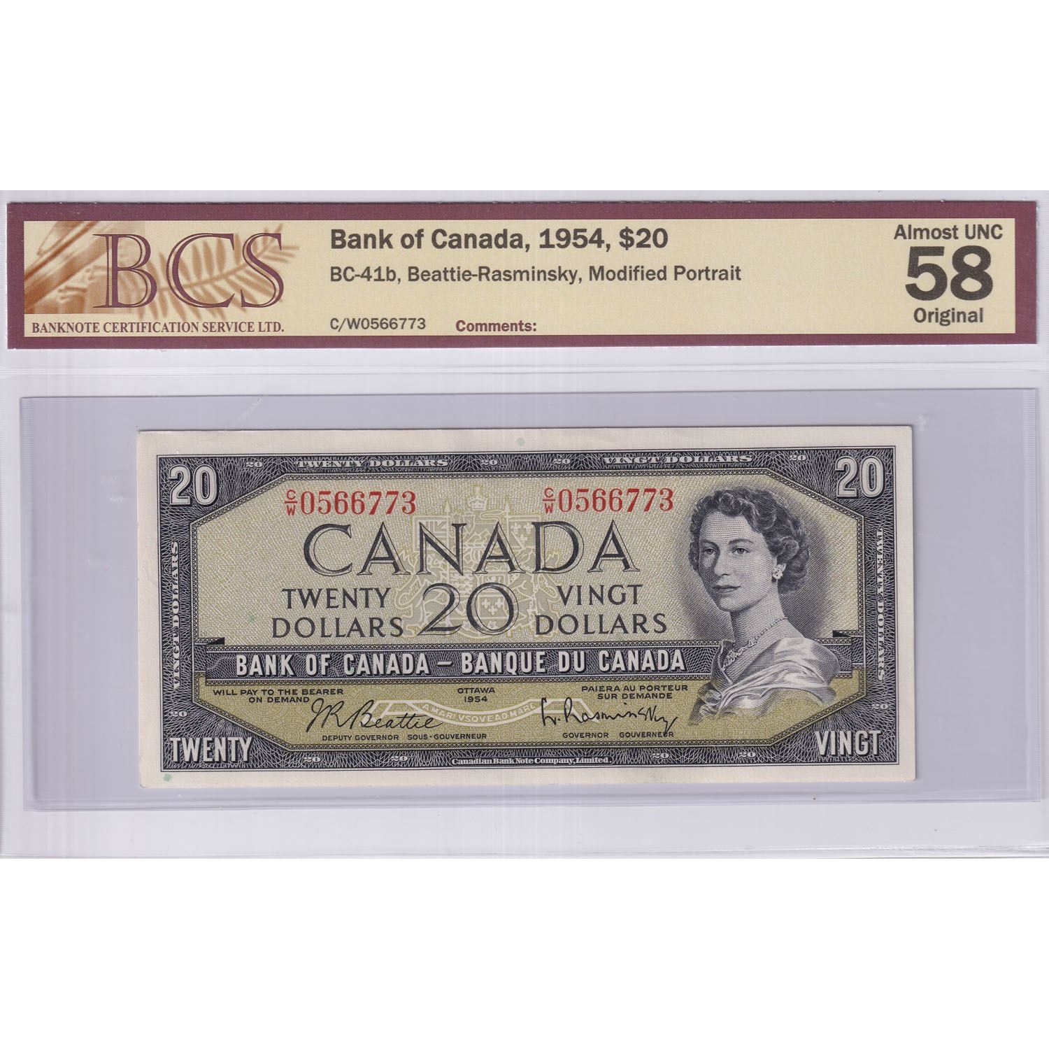 1954 $20 BC-41b, Bank of Canada, Beattie-Rasminsky, Modified Portrait, S/N: C/W0566773, BCS Certifie