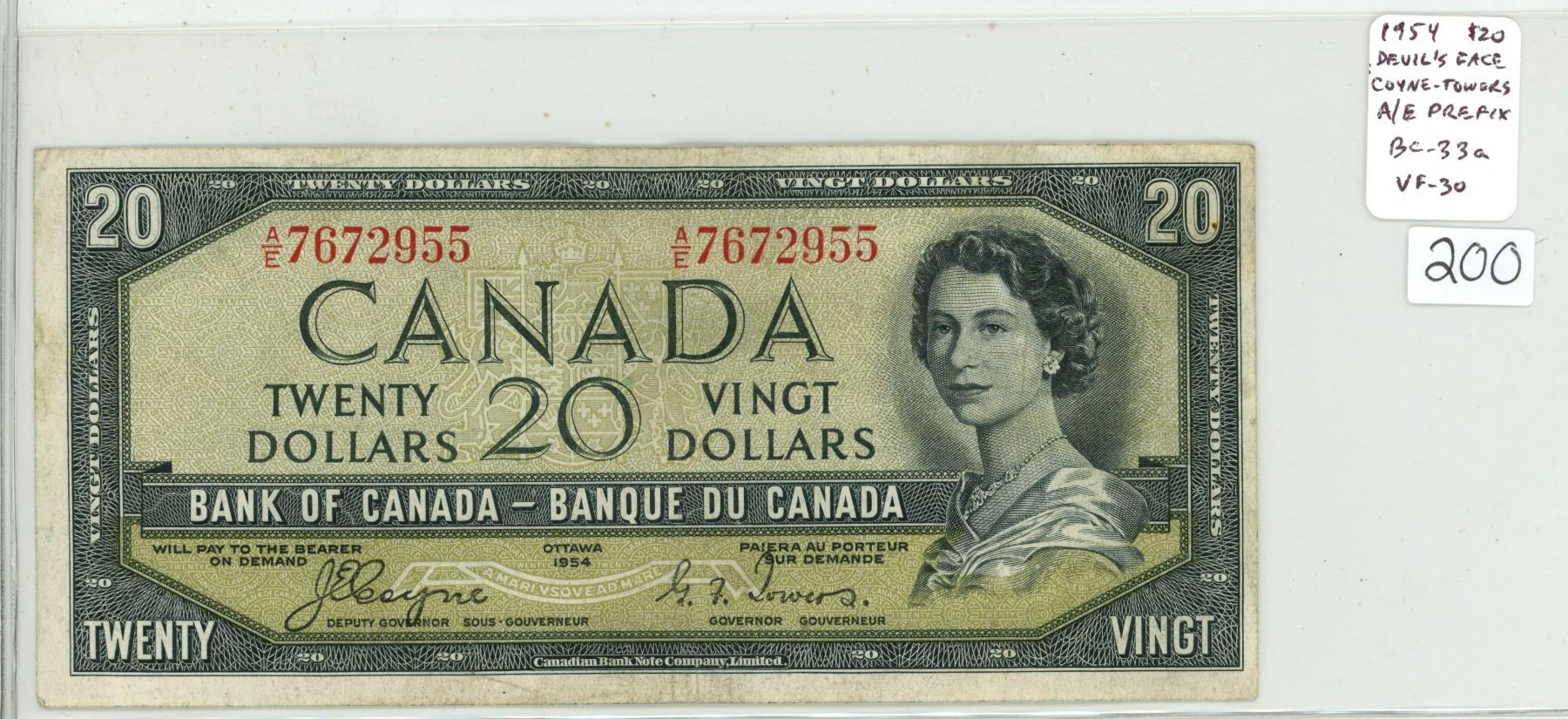 1954 $20 Devil’s Face note. Coyne-Towers signatures. A/E Prefix. BC-33a. VF-30.