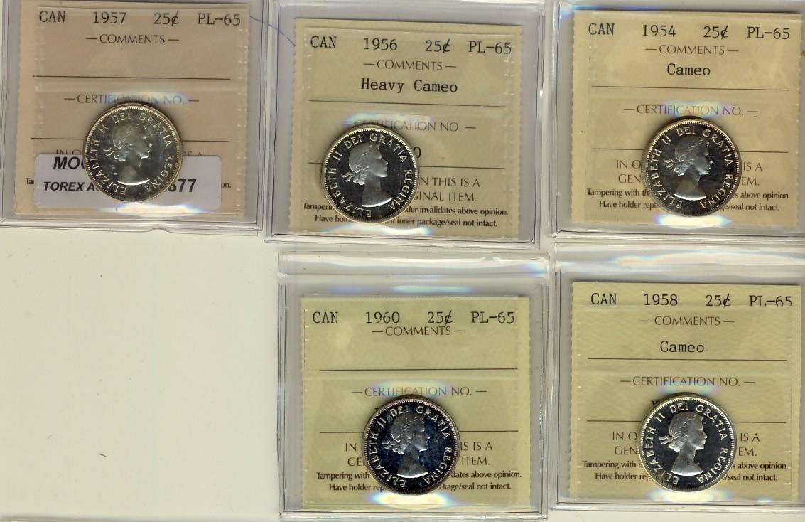 1954 25¢, 1956, 1957, 1958 & 1960 ICCS PL65. Lot of 5 coins some with Cameo to Heavy Cameo designat