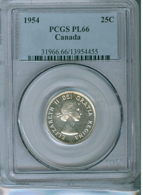 1954 25¢ PCGS PL66. Sharp example with very light cameo.