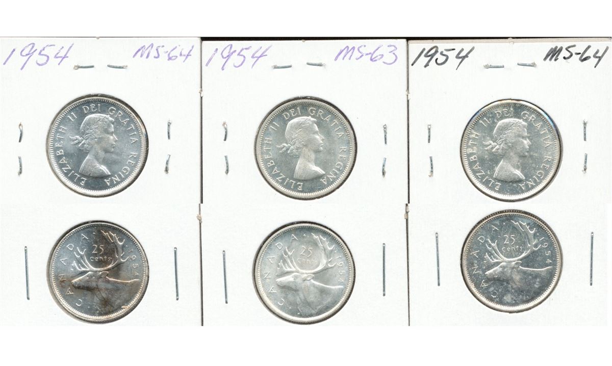 1954 25¢ UNC with lustre. Lot of 3 coins all MS.