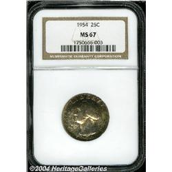 <B>1954<25C> MS67 NGC.</B></I> Fully struck with vibrant luster and a deep coating of speckled, multicolored patina over both sides. A single tiny milling mark, on the eagle's breast, is the only evidence of imperfect handling. <BR><BR><B>Important notice:</B> Heritage usually auctions material at the rate of 200-250 lots per hour. On some occasions eBay Live bid software or the Internet may not be able to keep up with the pace of the auction. We recommend placing a realistic absentee bid now as insurance to avoid disappointment. Occasionally the auctioneer may eliminate or reject an eBay Live bid, and the auctioneer may also reopen a lot after the close of the eBay live bidding (usually because we missed an audience bid), and may reject your bid even if it shows you as the winning bidder. By bidding via eBay Live, you agree that Heritage may award the lot to another bidder at its sole discretion under the circumstances described above or any other reasonable circumstances. Since eBay bids are not shown to us until we open the lot on the floor, we treat those bids just like floor bids. In most cases the floor responds before the eBay bid is presented to us, due to Internet lag time, so for consistency we have made it a policy that floor bids are always considered first over tie eBay live bids. Also please note that all Heritage lots purchased through eBay Live carry a 20% Buyer's Premium. Please make sure you read the Terms and Conditions before you bid.
