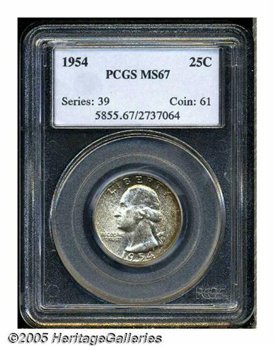 <B>1954<25C> MS67 PCGS.</B></I> Well struck with vibrant luster and near-pristine surfaces that are blanketed on both obverse and reverse by a coating of speckled dark-green and burnt-orange patina. Population: 29 in 67, 0 finer (3/05).<BR><I>From The Gary Kramer Collection of Washington Quarters.</B></I>