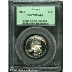 1954 25C PR67 Deep Cameo PCGS. The cameoed surface <B>1954 25C PR67 Deep Cameo PCGS.</B></I> The cameoed surfaces are virtually untoned and devoid of significant contact marks. A flashy looking specimen! Population: 18 in 67, 11 finer (10/04). <BR><BR><B>Important notice:</B> Heritage usually auctions material at the rate of 200-250 lots per hour. On some occasions eBay Live bid software or the Internet may not be able to keep up with the pace of the auction. We recommend placing a realistic absentee bid now as insurance to avoid disappointment. Occasionally the auctioneer may eliminate or reject an eBay Live bid, and the auctioneer may also reopen a lot after the close of the eBay live bidding (usually because we missed an audience bid), and may reject your bid even if it shows you as the winning bidder. By bidding via eBay Live, you agree that Heritage may award the lot to another bidder at its sole discretion under the circumstances described above or any other reasonable circumstances. Since eBay bids are not shown to us until we open the lot on the floor, we treat those bids just like floor bids. In most cases the floor responds before the eBay bid is presented to us, due to Internet lag time, so for consistency we have made it a policy that floor bids are always considered first over tie eBay live bids. Also please note that all Heritage lots purchased through eBay Live carry a 20% Buyer's Premium. Please make sure you read the Terms and Conditions before you bid. This lot is being auctioned in conjunction with a live floor auction by Heritage Galleries & Auctioneers. All final auction and invoice information will be supplied by Heritage Galleries & Auctioneers, and all other information should be considered preliminary. Lot:6014