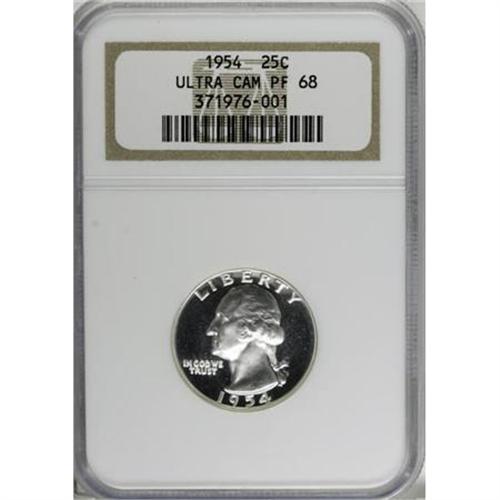 <B>1954 25C PR68 Deep Cameo NGC.</B></I> The jet-black fields are deeply mirrored, and the silver-gray devices are impressively frosted. Close inspection of the obverse and reverse surfaces, with the aid of low magnification, fails to reveal any troublesome hairlines or contact marks. Census: 14 in 68 Deep Cameo, 6 finer (8/07). <BR><BR><b>Shipping:</b> Coins & Currency (<a target="_blank" href="http://www.heritageauctions.com/common/shipping.php">view shipping information</a>)