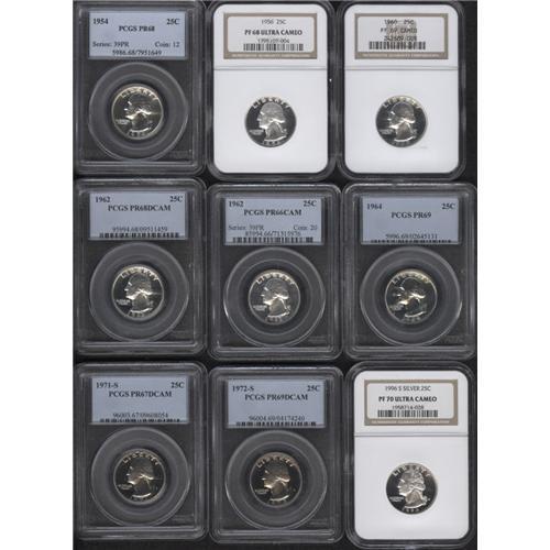 <B>1954 25C PR68 PCGS; 1956 PR68 Deep Cameo NGC; 1960 PR69 Cameo NGC; 1962 PR68 Deep Cameo PCGS; 1962 PR66 Cameo PCGS; 1964 PR69 PCGS; 1971-S PR67 Deep Cameo PCGS; 1972-S PR69 Deep Cameo PCGS;</B></I> and a <B>1996-S Silver PR70 Deep Cameo NGC.</B></I><BR><BR><b>Shipping:</b> Coin/Currency (<a target="_blank" href="http://www.heritageauctions.com/common/shipping.php">view shipping information</a>)