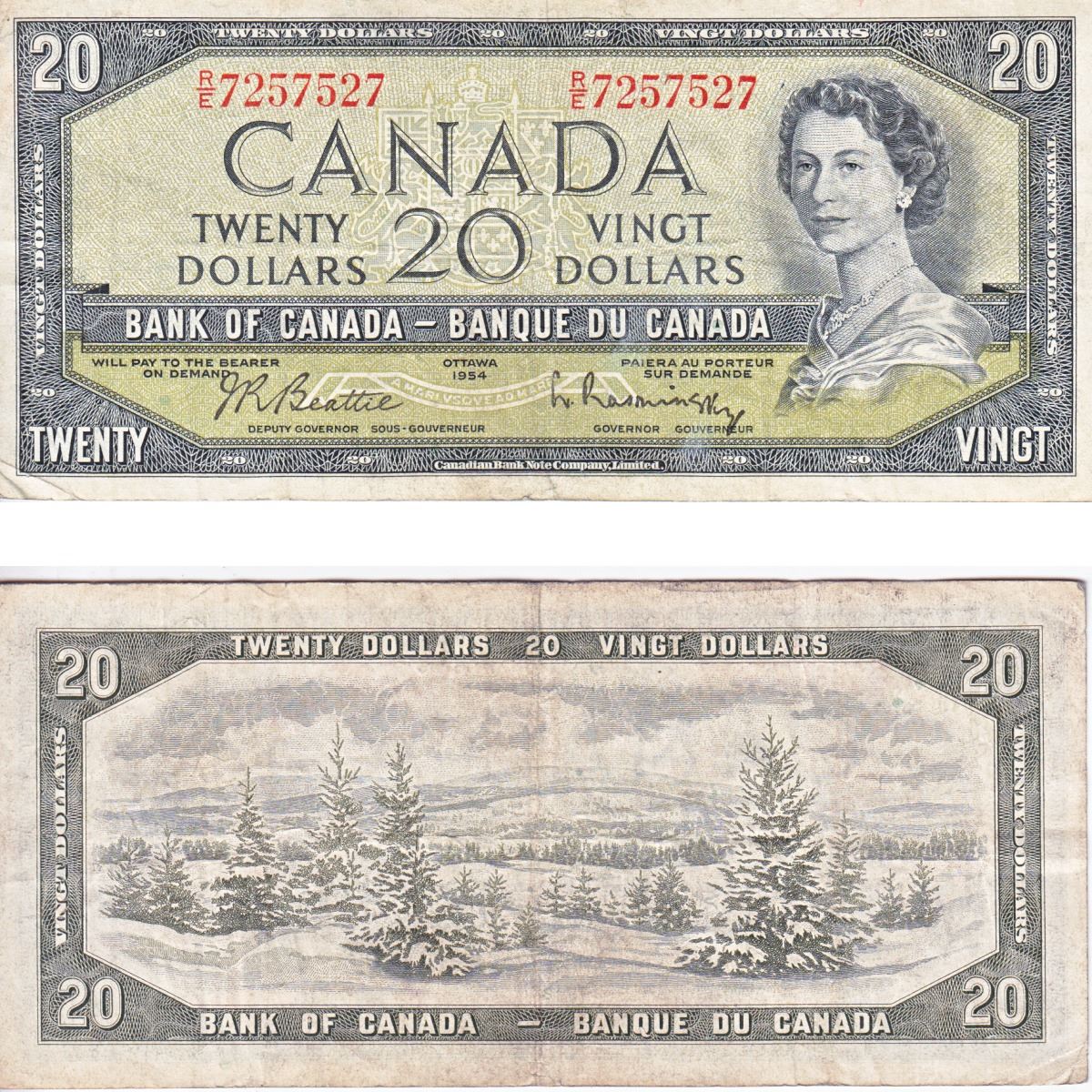 1954 3 Digit RADAR $20.00 Note from the Bank of Canada; cat code BC-41b, Beattie-Rasminsky signatures, Prefix R/E7257527 in F-VF Condition. Buyers Premium will be added on all items as per our terms of sale. We accept Paypal, Credit Card, E-Transfer Payments, Cheque or Money Orders (there is an additional 3% fee for using Paypal or Credit Card). All invoices will be emailed immediately following the auction, please contact us if you would like to pay by credit card or receive a new revised lower total for mailing in payment or sending an e-transfer (3% discount). All Items Are Sold "AS IS", no returns