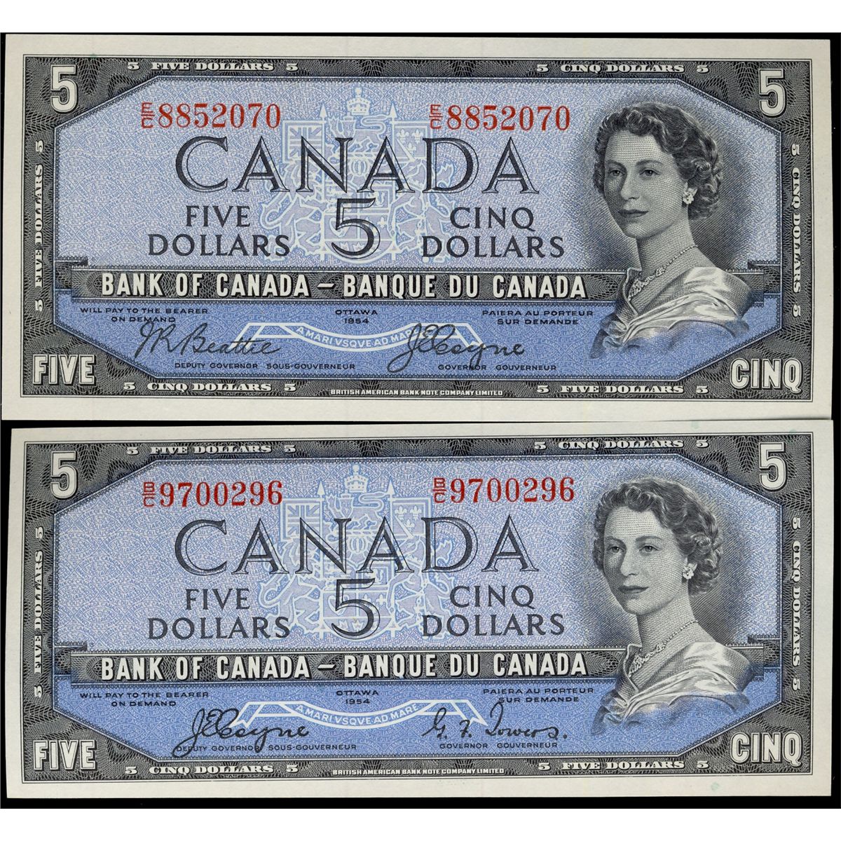 1954 $5 BC-31a #BC9700296 & BC-31b #EC8852070. Lot of 2 UNC notes, both lightly pressed out handling marks.