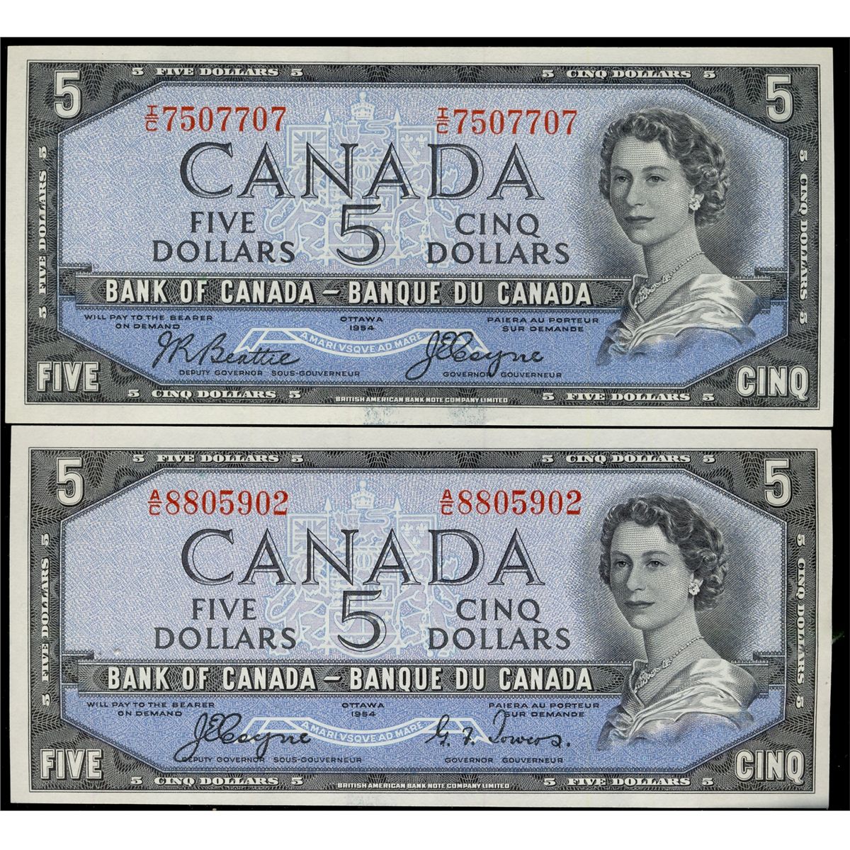 1954 $5 BC-31a. Lot of 2 original crisp UNC notes