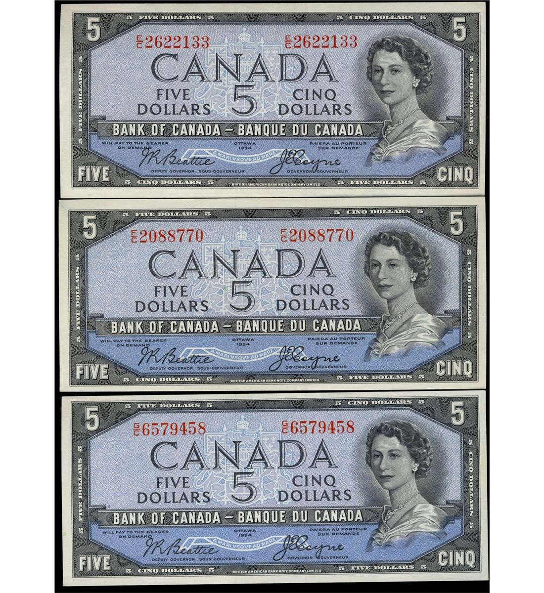 1954 $5 BC-31a. Lot of 3 original crisp AU/UNC notes