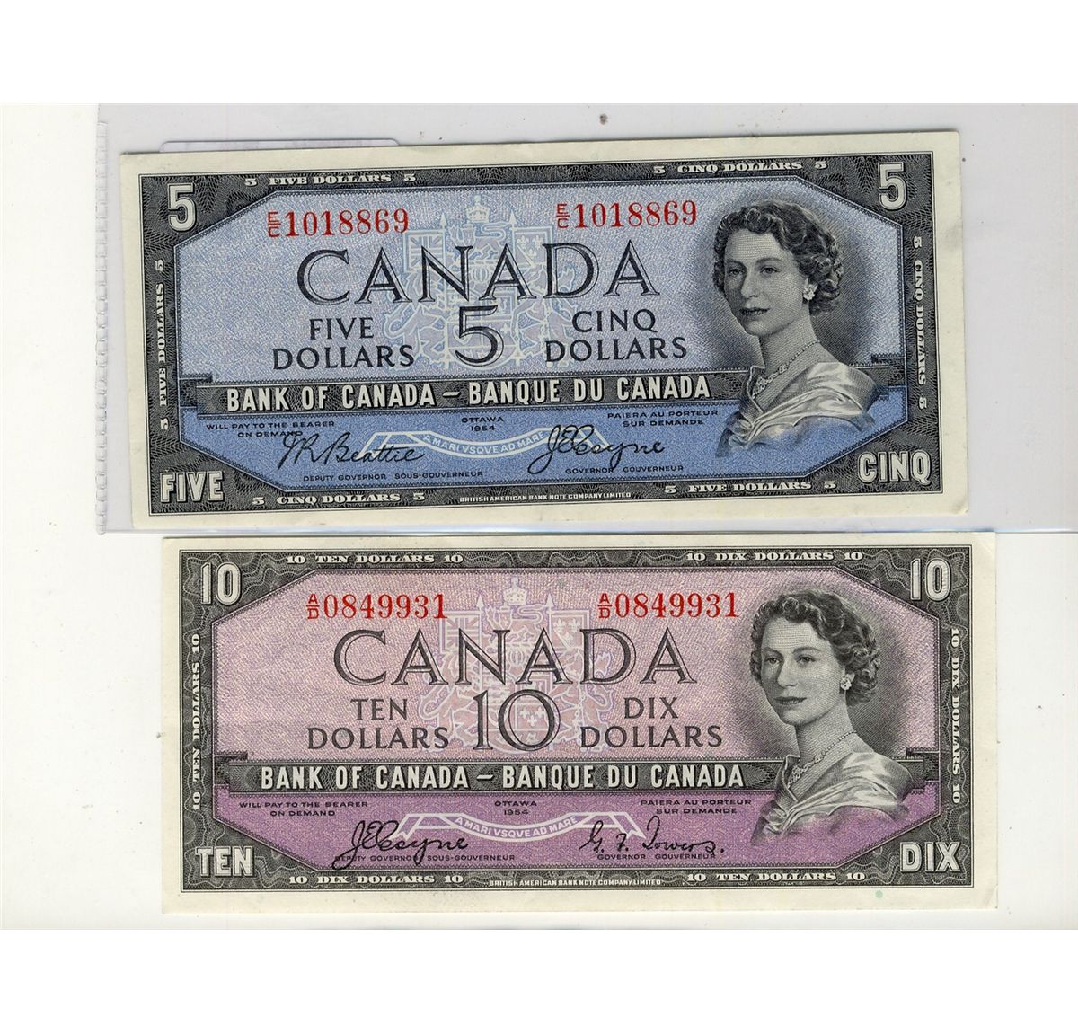 1954 $5 BC-31b & $10 BC-32a. Lot of 2 DF's notes EF to AU.