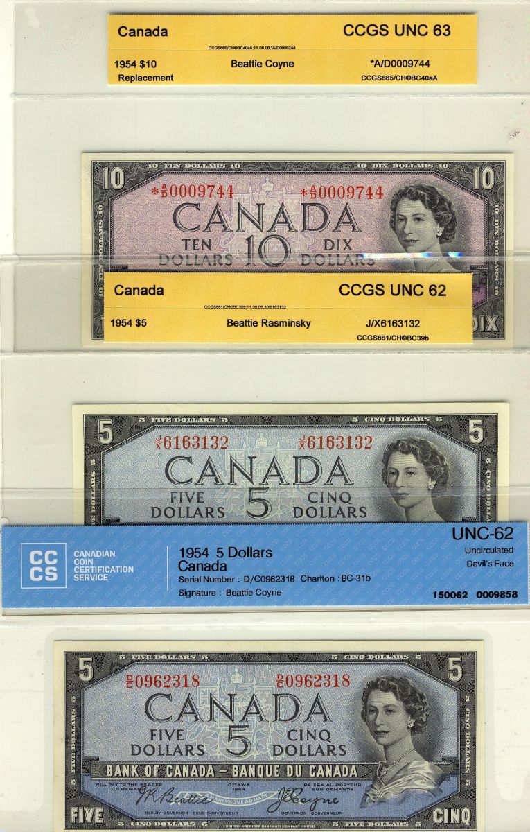 1954 $5, BC-31b BC-39b $5. Lot of 2 certified notes. BC-31b CCCS UNC62, BC39b CCGS UNC62