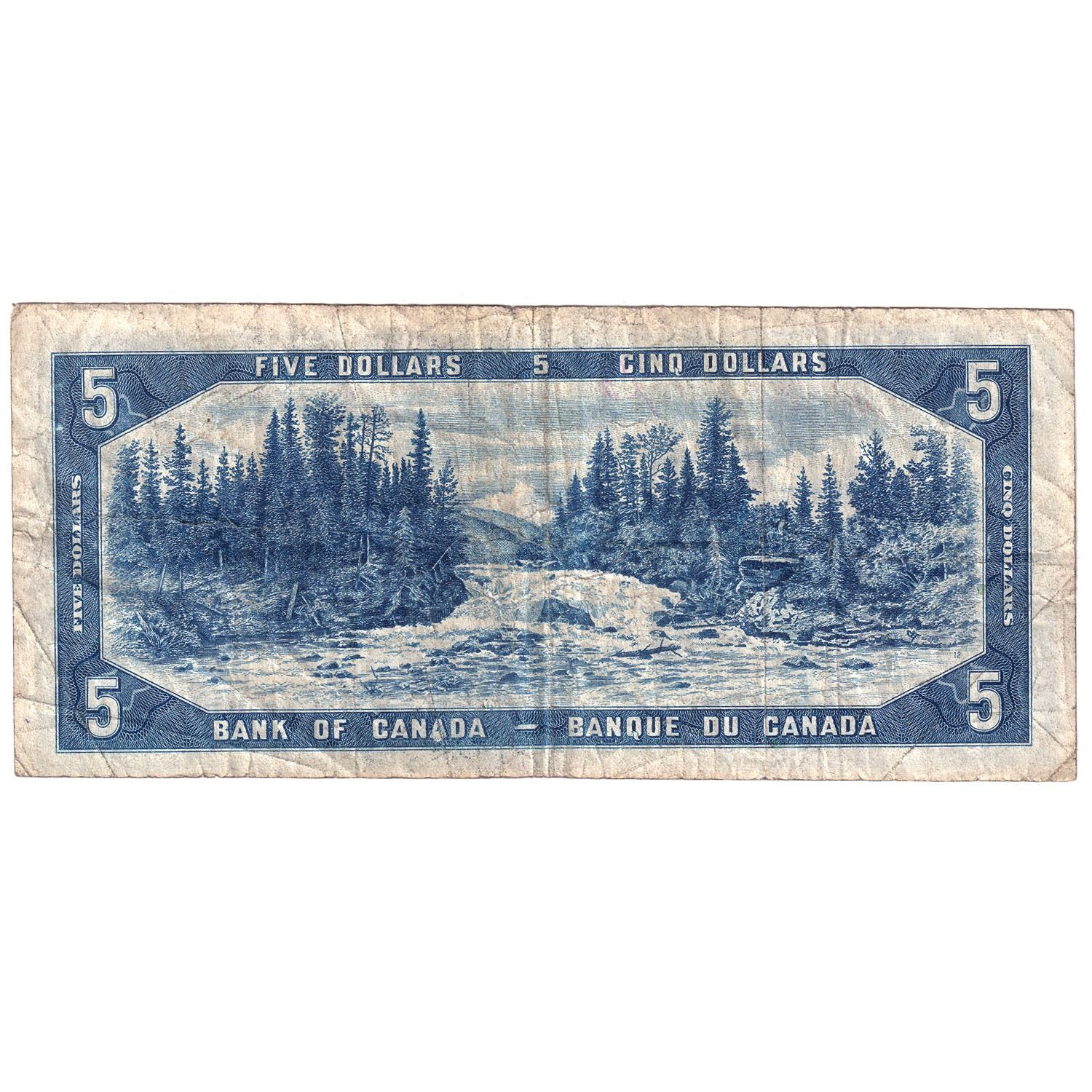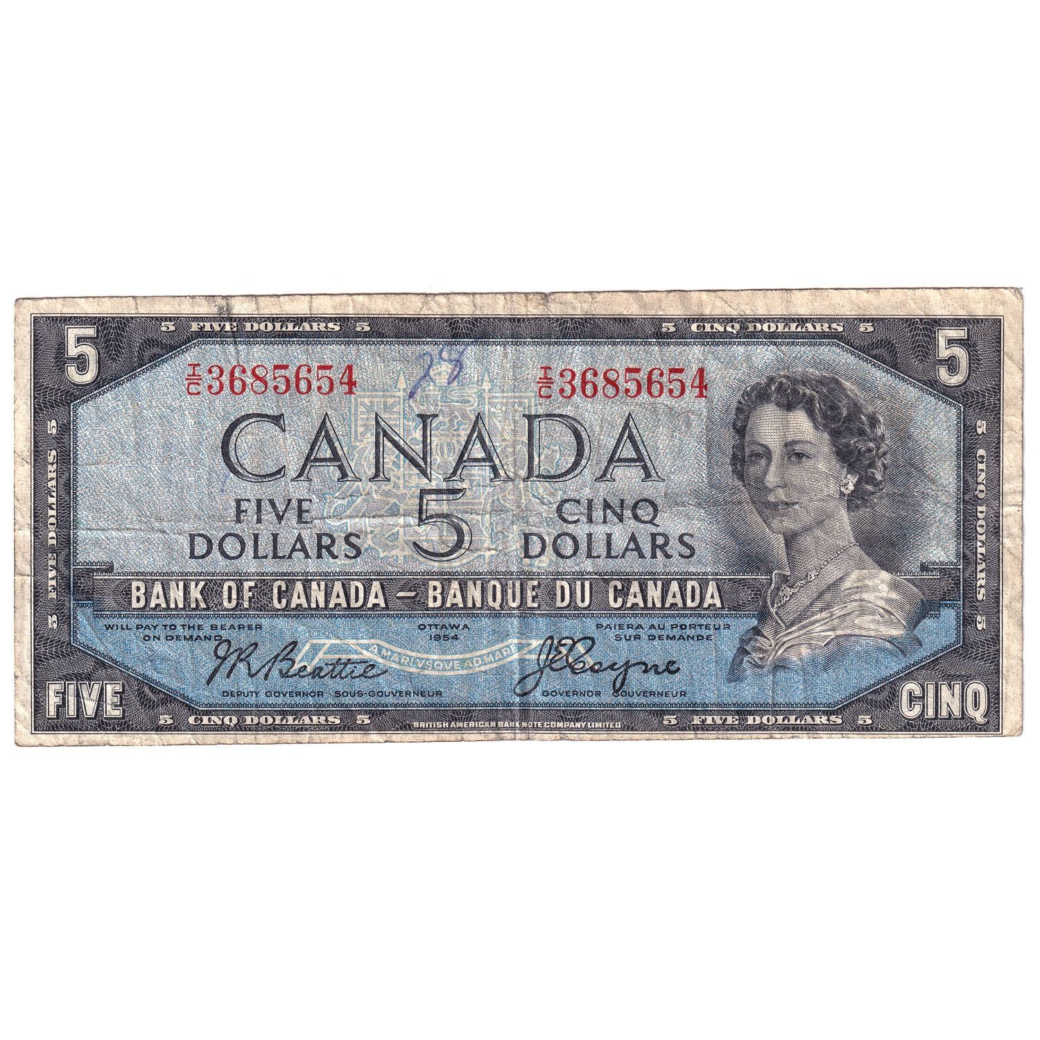 1954 $5 BC-31b Bank of Canada Devil's Face Note, Beattie-Coyne, I/C3685654, Fine (writing '28' and minor tear in upper margin).