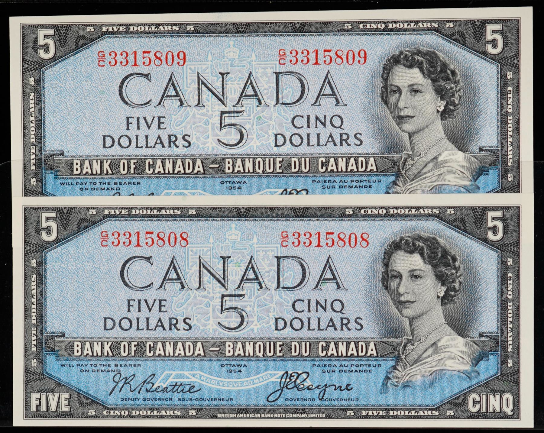 1954 $5 BC-31b #G/C3315808-5809. Lot of 2 consecutive Devil's Face notes in Choice Uncirculated or better.