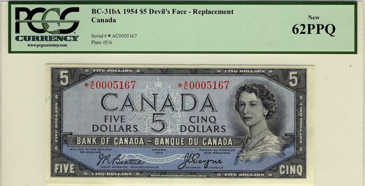 1954 $5 BC-31bA *A/C0005167 PCGS UNC62PPQ. Vibrant colours with great embossing. Excessively rare and desirable. Don't miss this opportunity to acquire a true rarity. Simply a splendid example, one of unforgettable quality and a highlight of this sale.