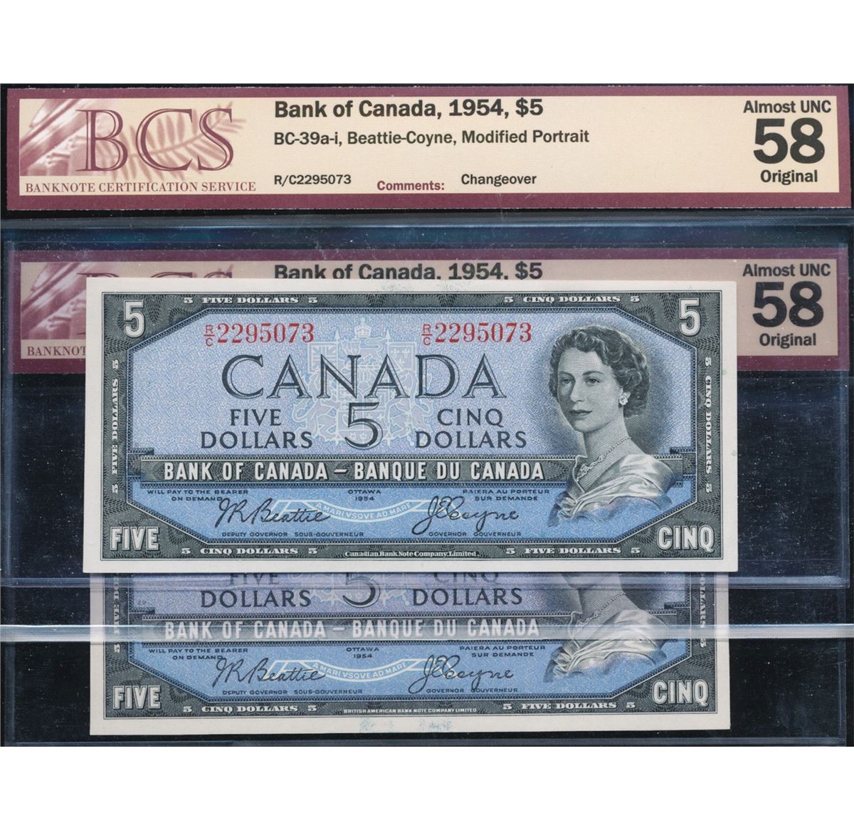 1954 $5 BC-39a #1RC0087540 & BC-39a-i #RC2295073 both BCS AU58 Original. Lot of 2 notes.
