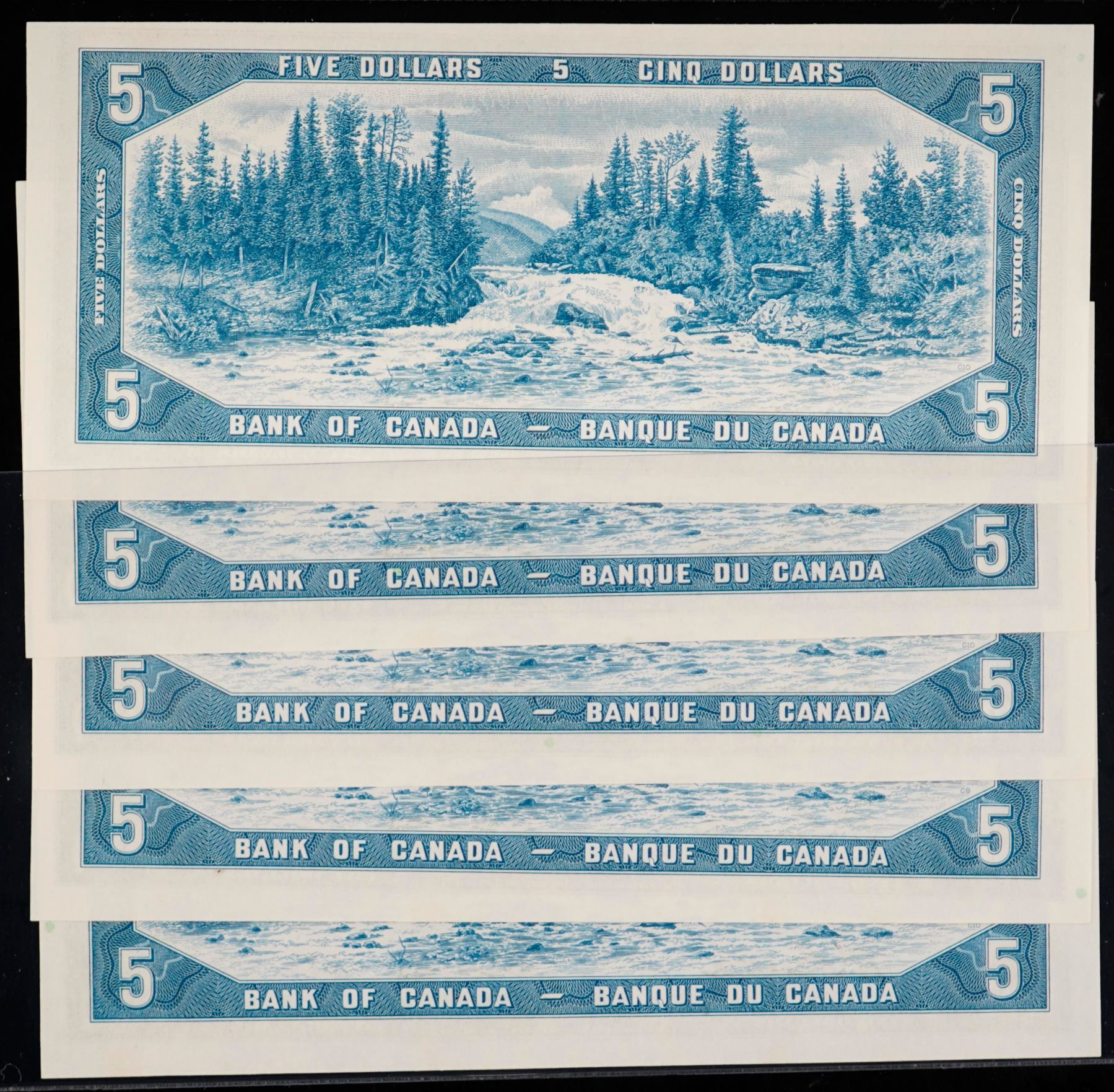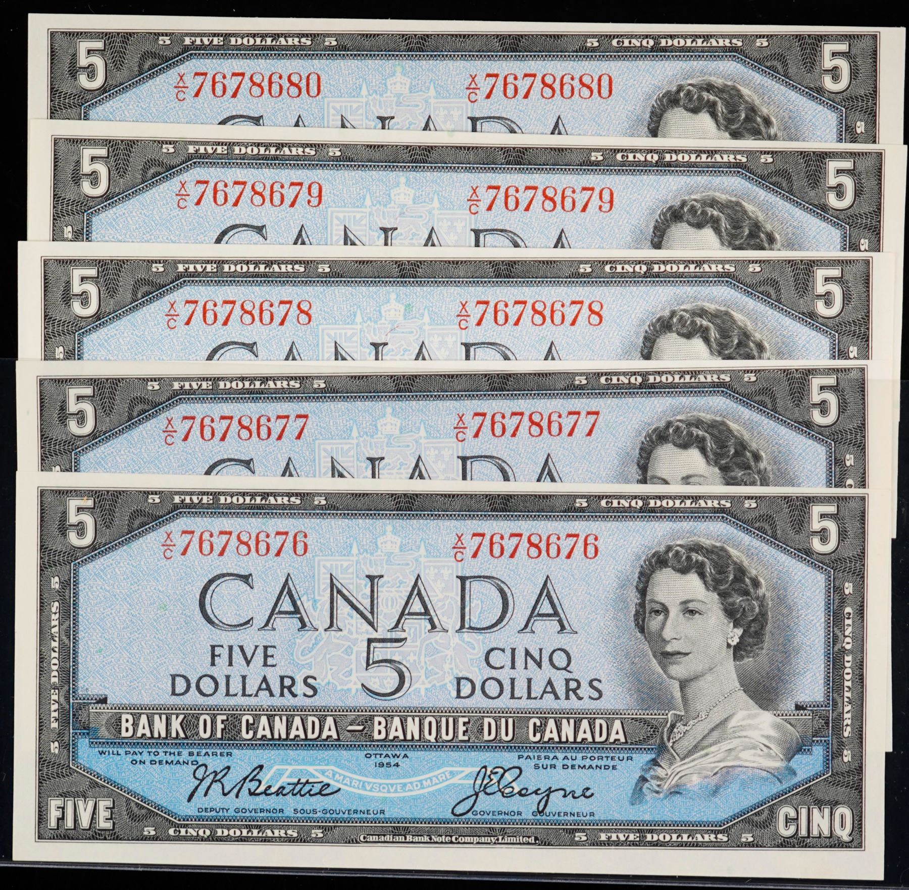 1954 $5 BC-39a-i #X/C7678676-8680 Beattie-Coyne. Lot of 5 notes in Uncirculated or better.