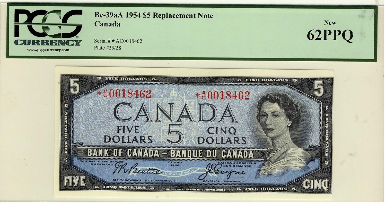 1954 $5 BC-39aA #*AC0018462 PCGS UNC 62PPQ. Probably trimmed.