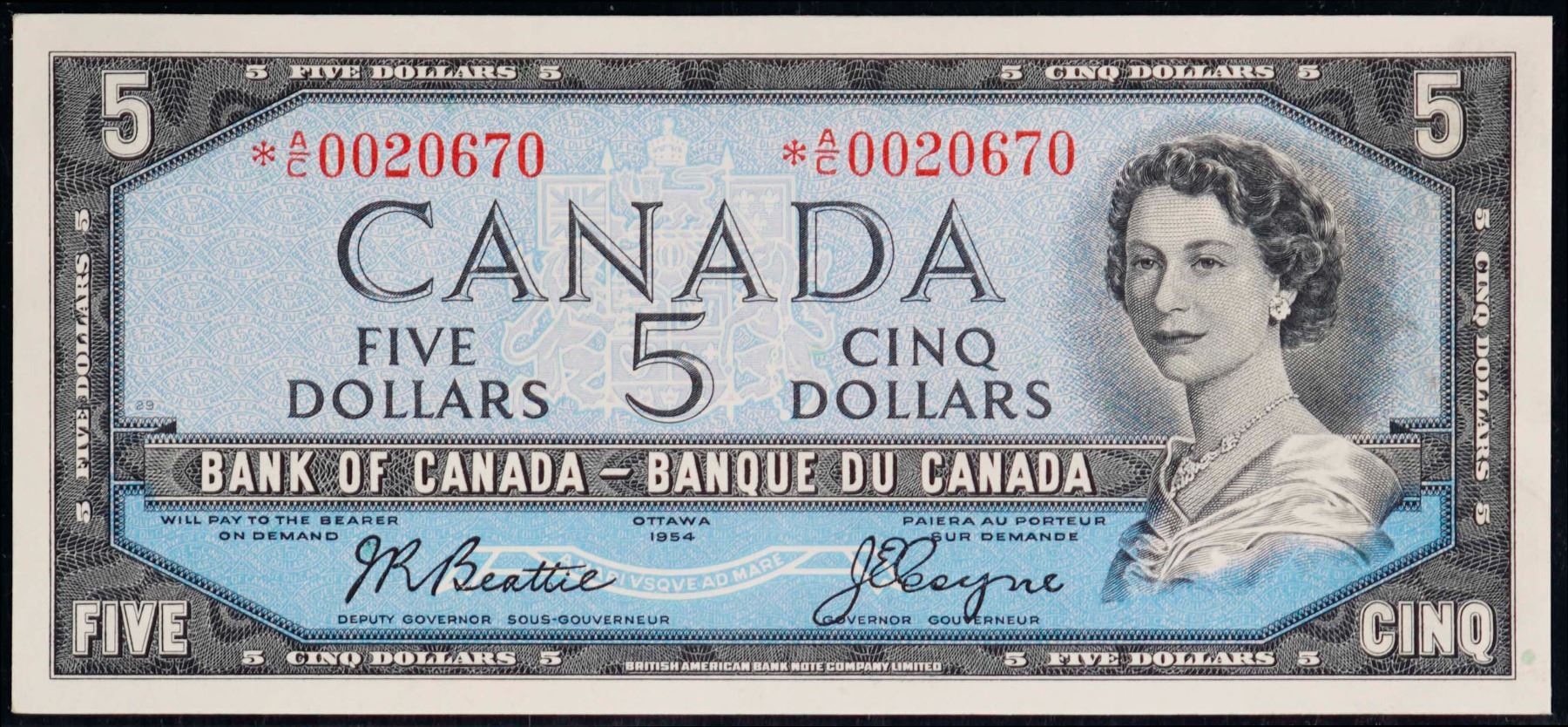 1954 $5 BC-39aA #*AC0020670, Legacy Superb Gem Uncirculated-67PPQ. This is a pristine example with great eye appeal, good margins and superb embossing.