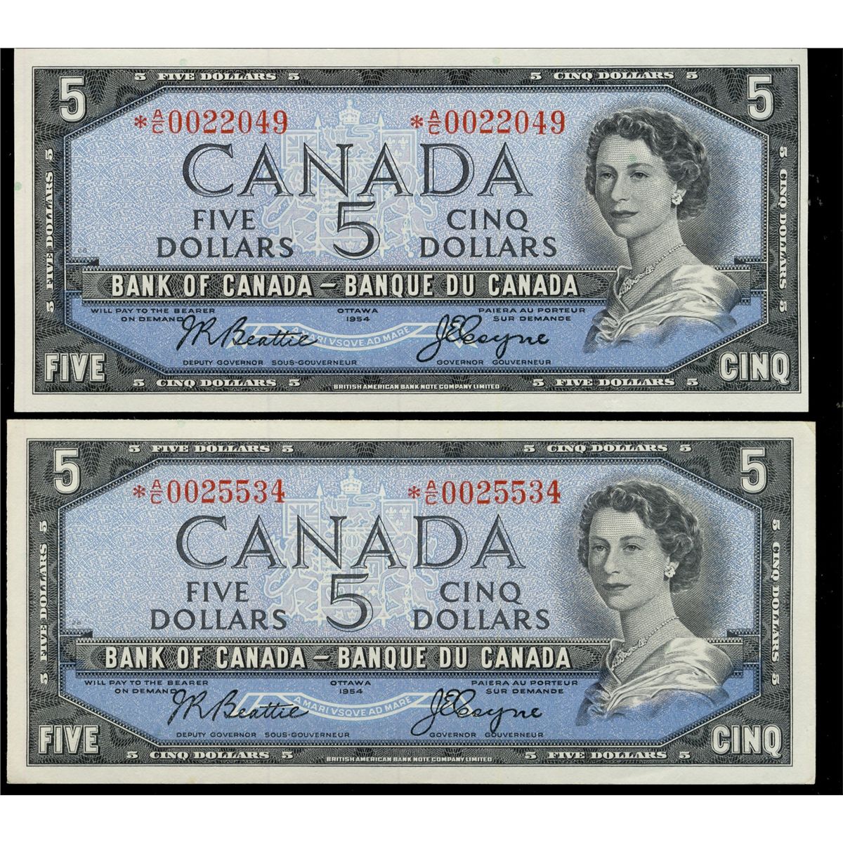 1954 $5 BC-39aA #*AC0022049 & #0025534. Lot of 2 notes both EF to AU.