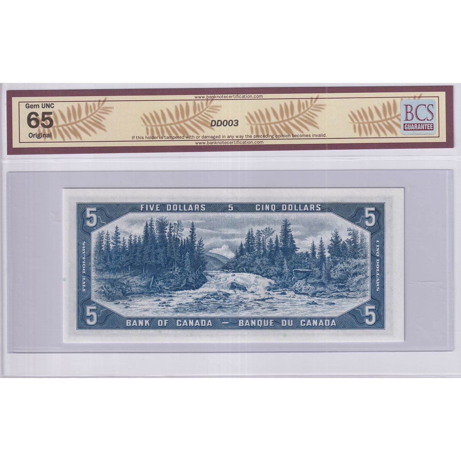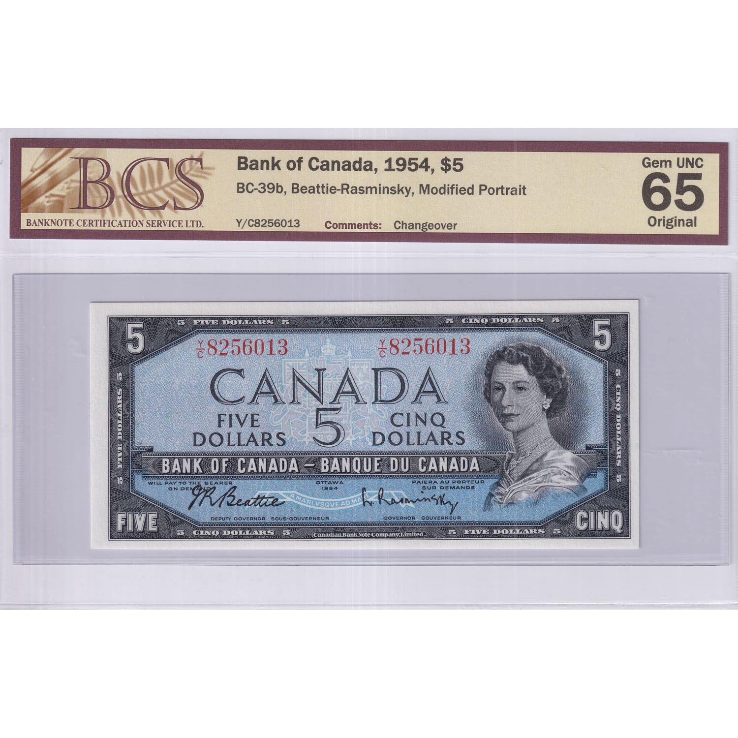 1954 $5 BC-39b, Bank of Canada, Beattie-Rasminsky, Modified Portrait, Changeover, S/N: Y/C8256013, BCS Certified GUNC-65 Original.