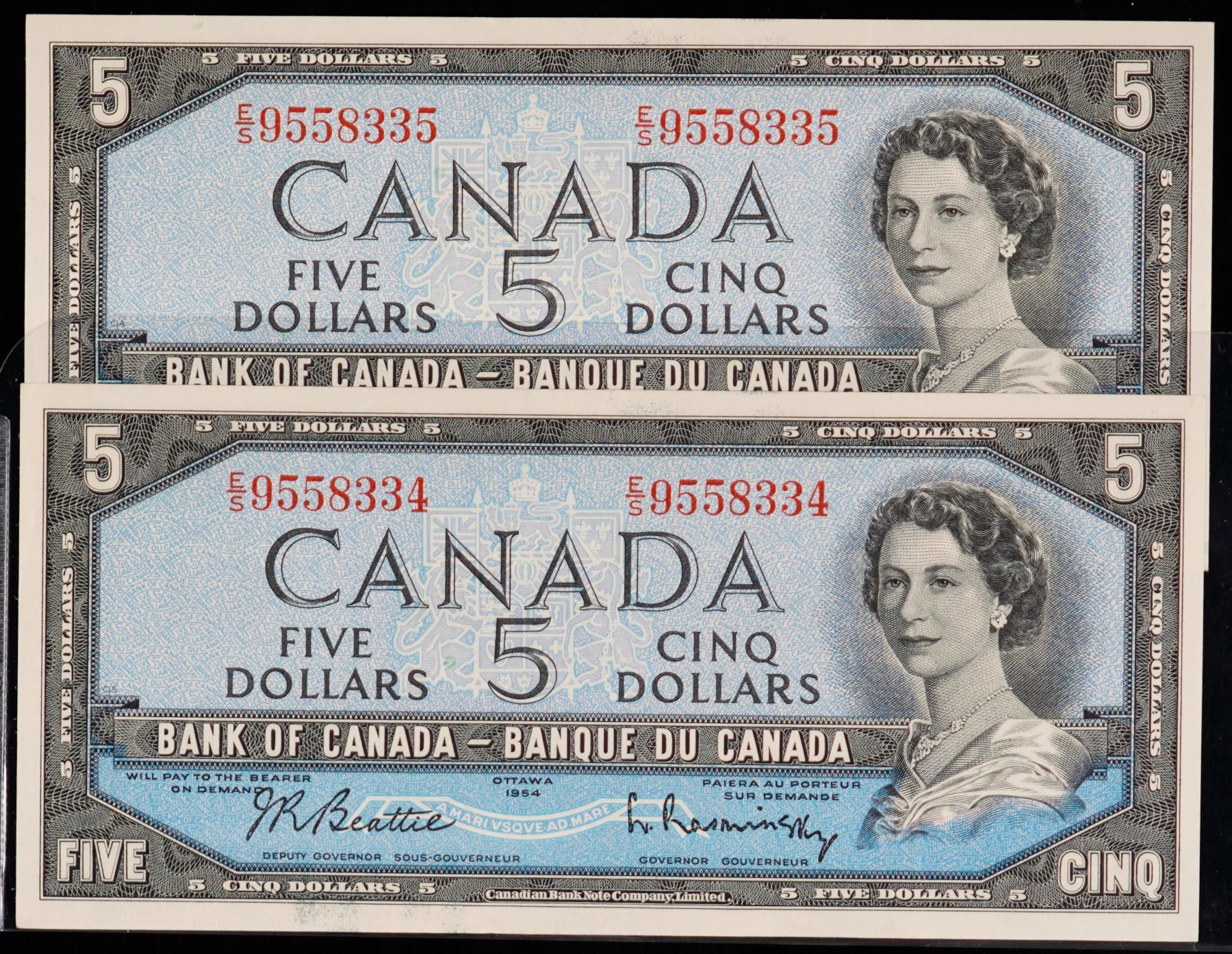 1954 $5 BC-39b #E/S9558334-8335 Lot of 2 consecutive notes EF