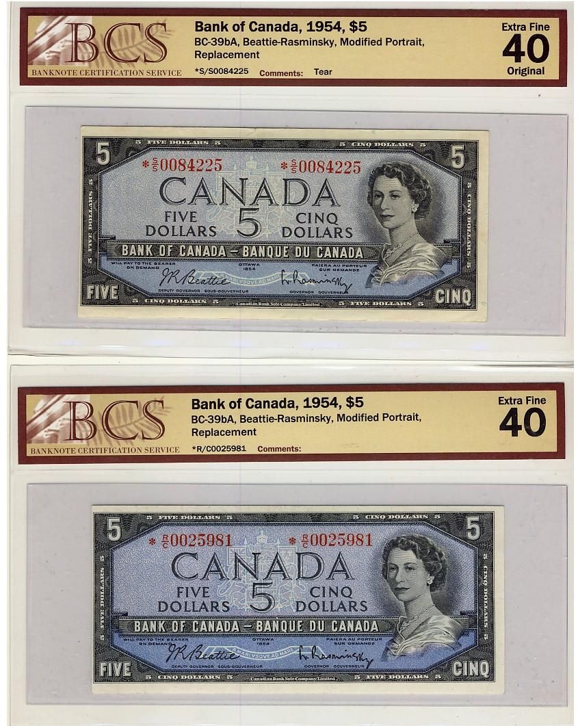 1954 $5 BC-39bA Lot of two notes; *R/C0025981, *S/S00842225, All BCS EF40