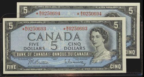1954 $5, BC-39bA *WS, A Gem Original pair of consective notes. Superb eye appeal with crisp and strong borders. #*WS0250694 / 693