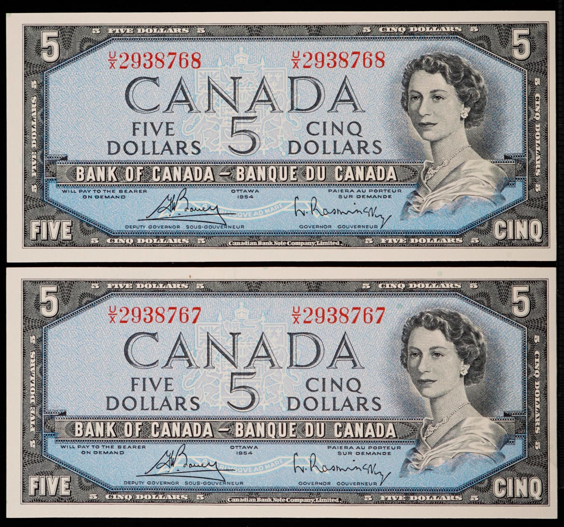 1954 $5 BC-39c #U/X2938767-8768 Lot of 2 consecutive notes Choice Unc to Gem Unc.