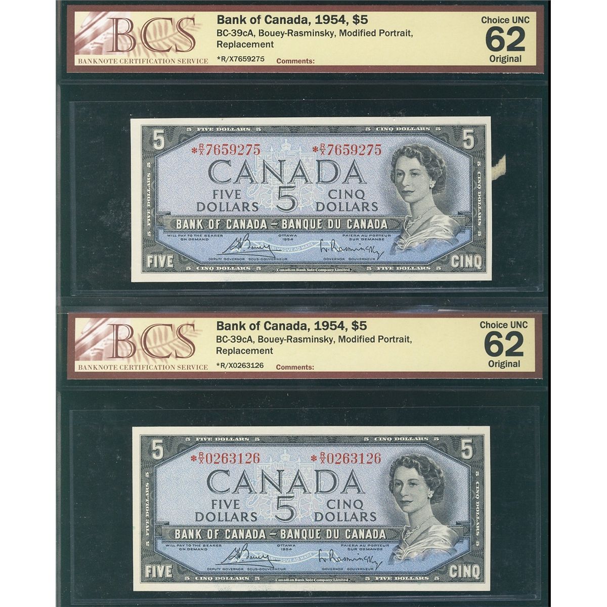 1954 $5 BC-39cA #*RX0263126/76559275 BCS UNC62. Lot of 2 notes.