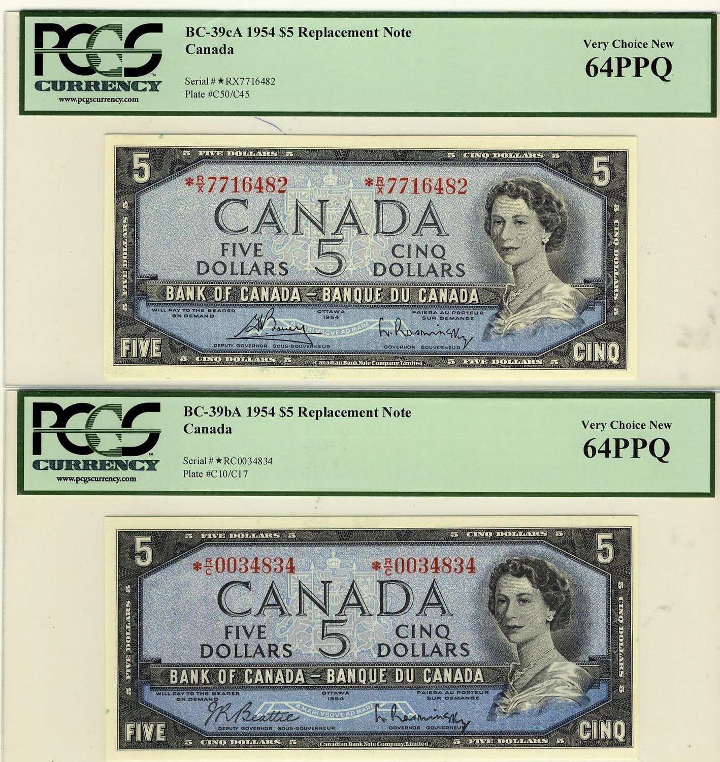 1954 $5 BC-39cA #*RX7716482 & *RC0034834 PCGS CH UNC64PPQ. Lot of 2 notes.