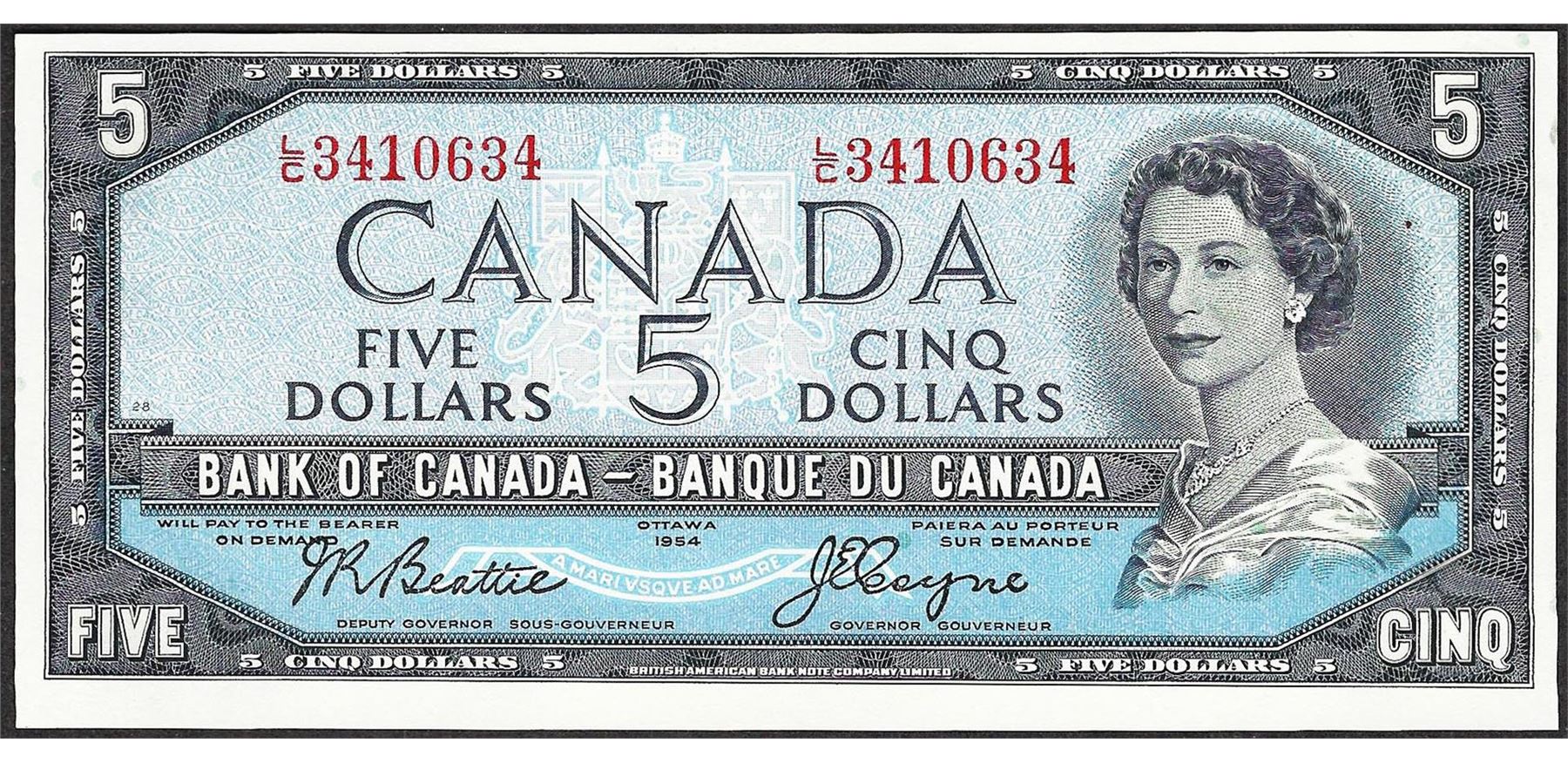 One 1954 $5 Bank of Canada Note.