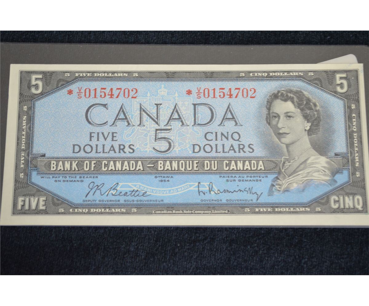 1954 $5 Canada Note - Replacement - CUNC-GUNC - *VS 0154702 - BC-39bA - Beattie/Rasminsky - Value: $275.00