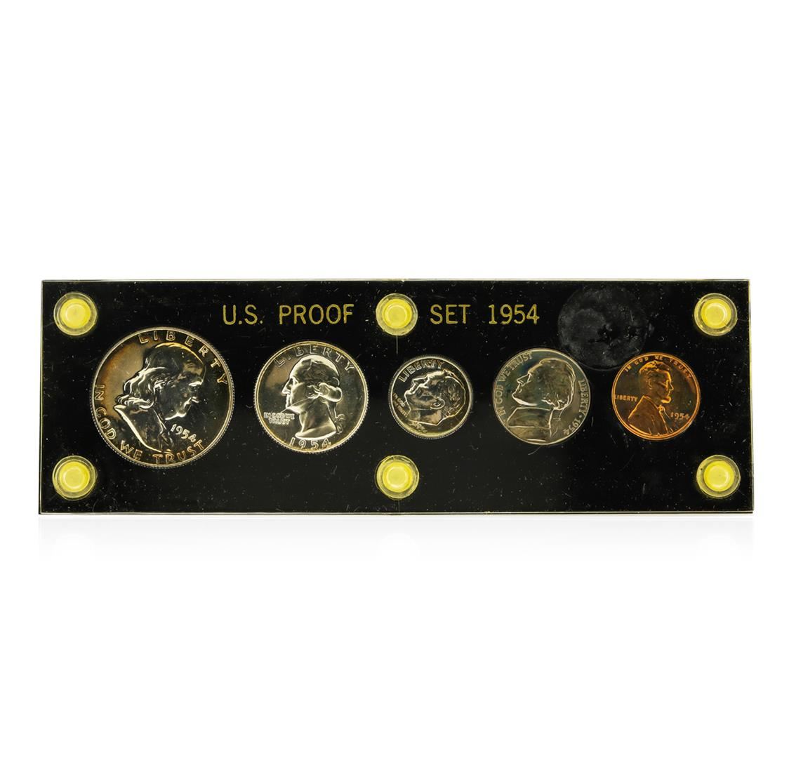 This 1954 (5) Coin Proof Set includes the following coins: 1954 Franklin Half Dollar, 1954 Washington Quarter, 1954 Roosevelt Dime, 1954 Jefferson Nickel, and a 1954 Lincoln Wheat Cent.