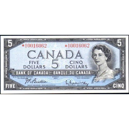 1954 Five Dollars Beattie-Rasminsky Replacement Note, BC-39bA Serial Number *R/C0016062, Uncirculated. Very slightly off centre toward the top