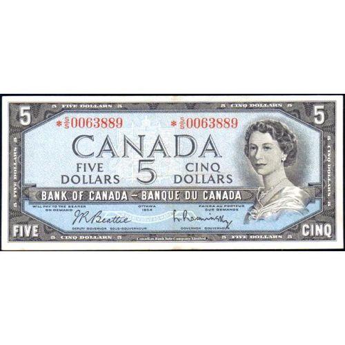 1954 Five Dollars Beattie-Rasminsky Replacement Note, BC-39bA Serial Number *S/S0063889, Uncirculated. Quite well centered