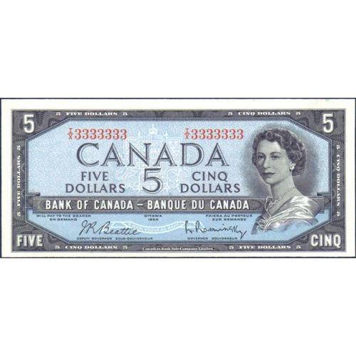 1954 Five Dollars Beattie-Rasminsky, BC-39b Solid Serial Number T/X3333333, PMG Gem Uncirculated 65 Exceptional Paper Quality