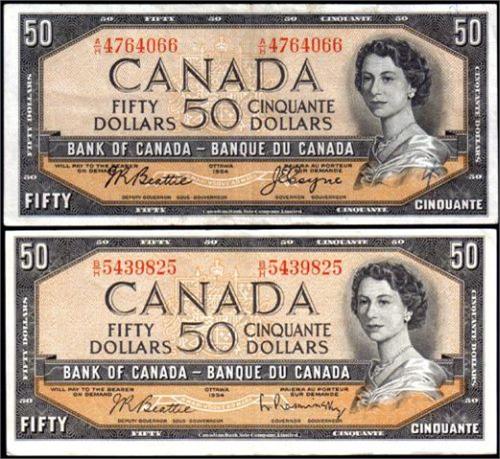 1954 Fifty Dollars Beattie-Coyne, BC-42a, serial number A/H4764066, VF-EF with small crayon number. Plus BC-42b serial number B/H5439825, EF