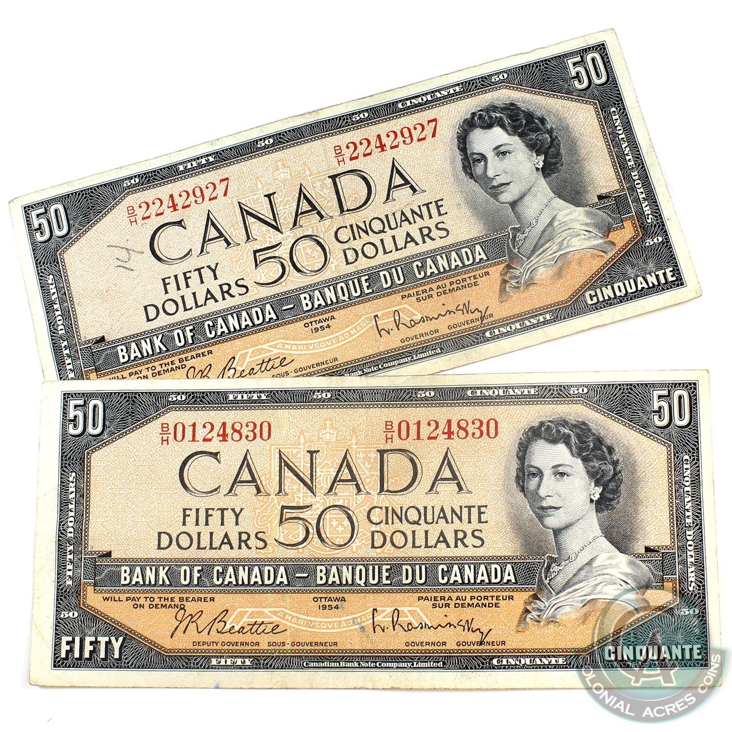 1954 $50 BC-42b Prefix B/H Bank of Canada Modified Portrait Notes. 2pcs