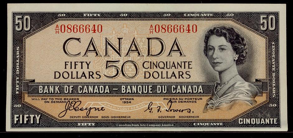 1954 $50 DF BC-34a #A/H0866640. AU-UNC issue with bright colours.