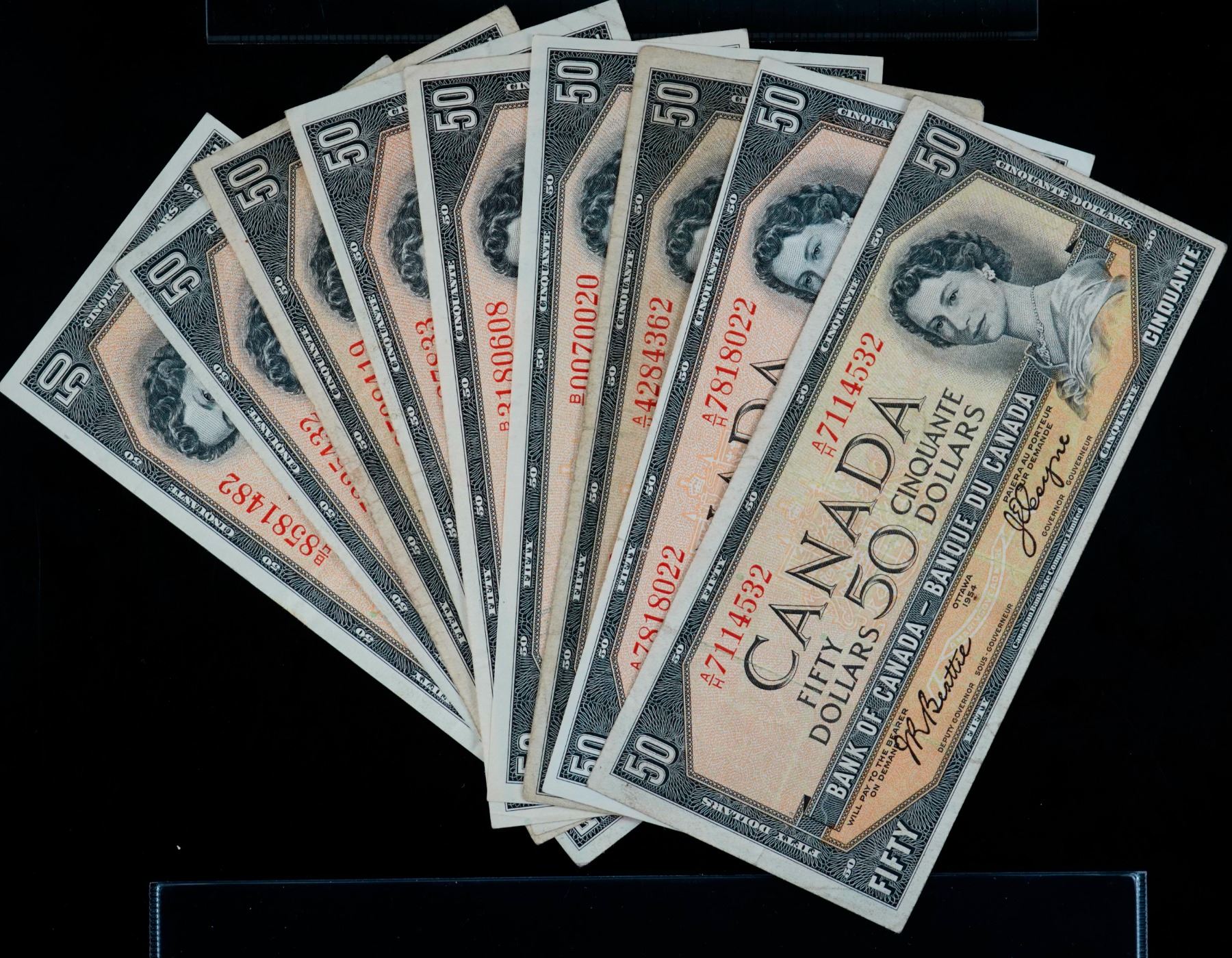 1954 $50 Lot; Includes various signatures. All Fine to VF-EF. Lot of 9 notes.